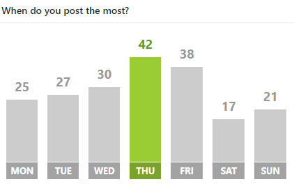 I was not aware but clearly Thursdays are my blog day. Last time, Friday (2) and Wednesday (3) where close follow-ups. Tuesday who came up as second to last, is now my 4th most active day, and Saturday keeps being the last on the row.