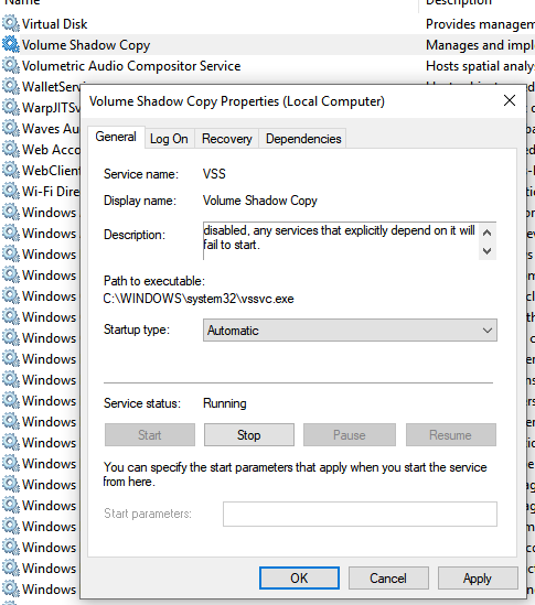 Try to start the Service : VSS manually;